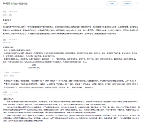 信中写道:“‘到祖国最需要的地方去建功立业’一直是中国年轻学子最鲜明的青春宣言,几十年来,爱国奉献、艰苦奋斗的‘西迁精神’和‘两弹一星’精神在各个场景轮番上演,无论是在脱贫攻坚战场还是在抗击疫情一线,都有年轻人奋斗的身影。梁启超在《少年中国说》中铿锵有力的写道‘少年强则国强’,面对今日之中国,吾辈是否亦觉热血沸腾、重任在肩?”同学们阅读信件后,无不为老一辈人攻坚克难的精神和可歌可泣的事迹所动容,纷纷来信表达自己的感想,据统计,截至5月3日任课教师共计收到回信2075封,从回信的内容来看,主要表达了四层意思: