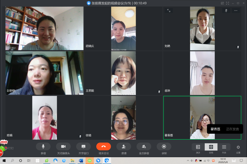 5月8日上午10:00,英语教研室全体教师采用钉钉视频会议形式召开了第十一期教学工作研讨例会,就英语课程深度融合专业群建设、英语课程改革、教学团队建设展开了充分讨论。会议由教研室主任张前蓉同志主持。