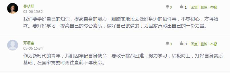 1.坚守爱国本分,增强使命担当。这场全球性的疫情防控检测出了中国的大国担当,凝聚了中国精神,彰显了制度优势。同学们表示,为自己生为中国人而自豪,同时也深知肩上重担,必须要努力成为祖国需要的栋梁之才,以实际行动履行新时代青年的责任与担当。