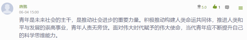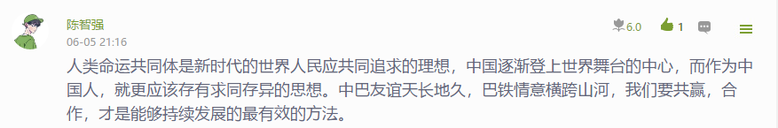 随后,重庆城市职业学院马克思主义学院思政课教师通过超星“学习通”平台组织2019级学生开展了在线主题讨论:大学生如何同世界各国青年一道,为推动构建人类命运共同体贡献自己的力量?学生们围绕疫情大考、中巴友谊、责任担当、大国风范、人类命运共同体等互动话题发表了两千余条学习感悟和体会。此次主题讨论,同学们突出表达了三层意思: