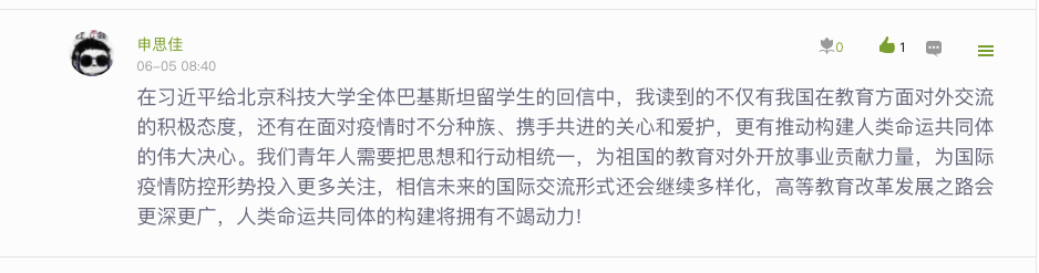 第一,肯定中巴友谊,携手共促发展。疫情发生以来,中巴两国相互支持,密切合作,并肩抗疫。在疫情袭击中国时,巴基斯坦送来自己储备的几乎全部口罩,随后中方根据巴方需要,向巴基斯坦派出医疗专家组、提供政府无偿援助、发动社会各界捐款捐物,这是超越世纪的情谊。希望在习近平总书记的领导下,两国关系变得更加强大,中巴两国青年大学生进一步加强思想文化交流,让中巴友谊结出更丰硕的成果。