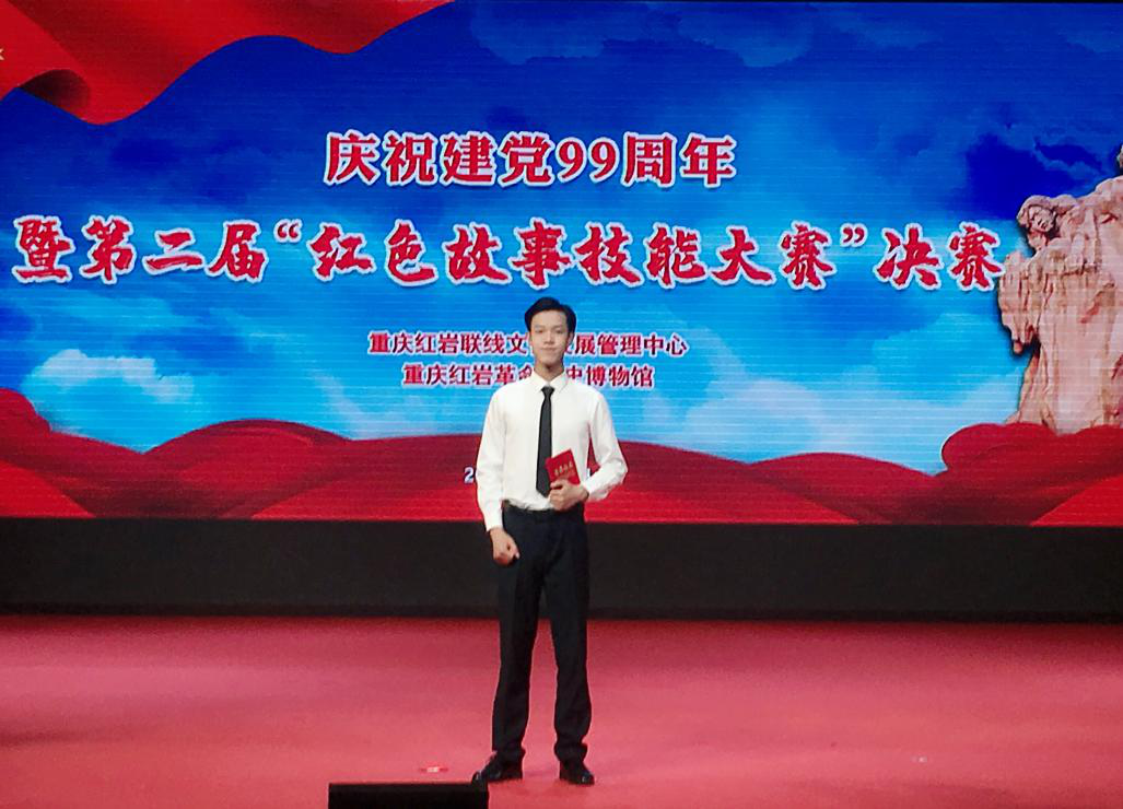 为深入学习贯彻习近平新时代中国特色社会主义思想和党的十九大精神,庆祝建党99周年,进一步讲好红色故事、传承红色基因、弘扬革命精神,在马克思主义学院思政组教师的指导下,我校大数据学院2019级云计算专业的谢奥运同学经过层层选拔成功晋级,在我校校馆合作单位重庆红岩联线文化发展管理中心“第二届红色故事技能大赛”6月30日的决赛中,获得业余组第六名的好成绩,喜获三等奖。