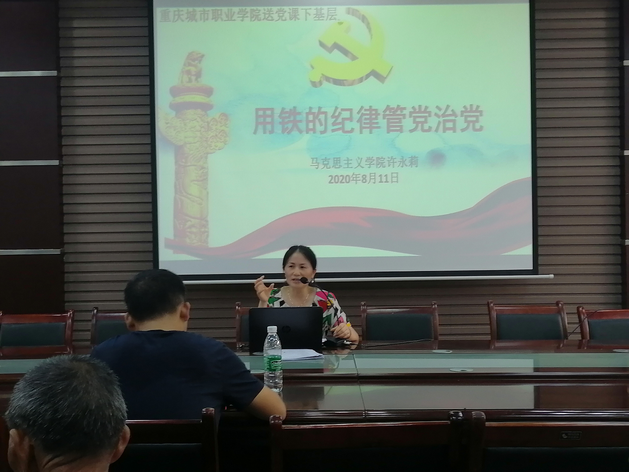 为学习践行习近平总书记关于扶贫工作的重要论述、助力贫困村脱贫攻坚奔小康,2020年8月11日,重庆城市职业学院马克思主义学院(基础课教学部)党支部书记、院长许永莉同志,思政教研室主任文国琴同志为丰都县保家寺村送党课。马院部分党员代表及保家寺村党委会全体成员、扶贫工作队干部以及在村三十余名党员参加了此次学习活动。